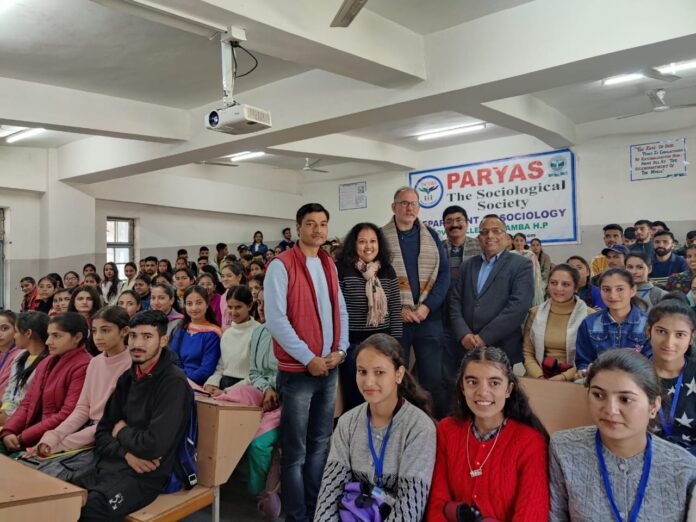 राजकीय महाविद्यालय चंबा में लेक्चर सीरीज रिसर्च सेंटर चंबा एवं प्रयास सोसोलजिकल सोसाइटी द्वारा “आइक्यूएसी” इंटरनेशन लेक्चर सीरीज का आयोजन किया गया। जिसमें बतौर मुख्यातिथि महाविद्यालय चंबा प्राचार्य डॉ. शिवदयाल ने शिरकत की। वहीं डॉ. महेंद्र सलारिया ने स्टाफ व छात्र-छात्राओं सहित अपनी विशेष उपस्थिति दर्ज करवाई। जबकि “आइक्यूएसी” इंटरनेशन लेक्चर सीरीज अगुवाई बतौर मुख्य वक्ता सीनियर रिसर्च फेलो डॉ. रिचर्ड सोअस विश्वविद्यालय लंदन ने की। लेक्चर सीरीज के आयोजक डॉ. महेंद्र सलारिया ने मुख्य वक्ता का चंबा पधारने पर स्वागत एवं धन्यवाद किया। उन्होंने कहा यह लेक्चर सीरीज रिसर्च सेंटर चंबा एवं प्रयास सोसोलजिकल सोसाइटी द्वारा आयोजित की जा रही है। लेक्चर सीरीज में ग्रेजुएशन के बाद क्या और विभिन्न क्षेत्रों में सामाजिक विषयों में शोध के तरीकों पर चर्चा की। सीरीज के मुख्य वक्ता डॉ. रिचर्ड ने रिसर्च में विभिन्न विषयों और उससे संबंधित कार्य और शोध सूट के तरीकों पर विस्तार से चर्चा की। इसी अवसर पर उन्हीं के साथ आई सोअस विश्वविद्यालय लंदन की छात्रा ऋचा ने विश्व की विभिन्न यूनिवर्सिटी में किस तरह से स्कॉलरशिप लेकर पढ़ाई की जा सकती है उस पर विस्तार से चर्चा की। उन्होंने कहा कि आज भारत नहीं बल्कि विश्व की बहुत सी यूनिवर्सिटी है जो बच्चों को पढ़ने के लिए अनेक स्कॉलरशिप देती हैं। वहीं इस मौके पर महाविद्यालय चंबा प्राचार्य डॉ. शिव दयाल ने सभी छात्रों को शोध के आयाम व विभिन्न छात्र वृत्तियों को प्राप्त करने हेतु प्रयासरत रहने की प्रेरणा दी।