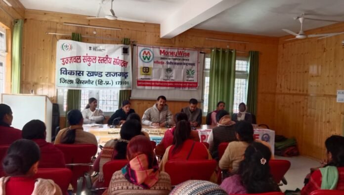 शनिवार को हिमाचल प्रदेश राज्य सहकारी बैंक राजगढ़ और यूको बैंक राजगढ़ के संयुक्त संयोजन से खंड विकास कार्यालय में एकदिवसीय वित्तीय साक्षरता शिविर का आयोजन किया गया । जिसमें हिमाचल प्रदेश राज्य सहकारी बैंक के प्रबंधक उम्मेद सिंह कंवर और यूको बैंक राजगढ़ के प्रबंधक प्रीतिश वालिया, केरल से आई मेंटर, क्लस्टर लेवल फेडरेशन की प्रधान सीमा और सचिव अपर्णा ठाकुर, सह संयोजक डिंपल विकासखंड राजगढ़ के अंतर्गत आने वाले लगभग चौबीस ग्रामीण संगठनों के पदाधिकारीयों सहित लगभग 50 लोगों ने भाग लिया ।