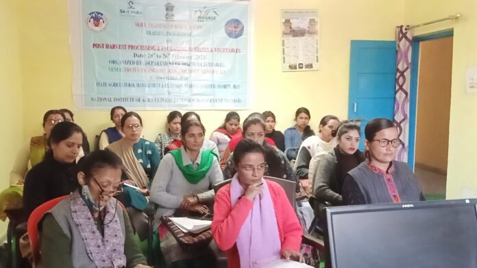 उद्यान विभाग राजगढ़ द्वारा विकास खण्ड राजगढ़ की ग्राम पंचायतो की महिलाओं के लिए सात दिवसीय प्रशिक्षण शिविर का आयोजन किया जा रहा है | कनिष्ठ सहायक जगदीश ठाकुर ने जानकारी देते हुए बताया कि इस सात दिवसीय शिविर का शुभारम्भ राजगढ़ विषय विशेषग्य डॉ. देविन्द्र अत्री ने किया | इस अवसर पर डॉ. देविन्द्र अत्री ने बताया कि राजगढ़ की विभिन ग्राम पंचायत में इस तरह के शिविर विभाग द्वारा पहले भी आयोजित किये जा चुके है, जिसमे हाल ही में ग्राम पंचयात माटल ब्खोग, जदोल ट्प्रोली में शिविर आयोजित किये जा चुके है | यह शिविर स्किल इण्डिया के तहत लगाये जा रहे है जिसमें प्रोसेसिंग ऑफ़ फ्रूट वेजिटेबल और पेकिजिंग के तहत सात दिवसीय शिविर का आयोजन किया जा रहा है | उन्होंने बताया कि इस शिविर का मुख्य उदेश्य है कि जिस तरह से 20 से 35 प्रतिशत फल और सब्जिया ऐसे ही बरबाद हो जाती है जिसकी और कोई भी ध्यान नहीं देता ईसी वेस्ट को प्रोसेसिंग करने के लिए यह शिविर लगाये जा रहे है | इस अवसर पर उद्यान प्रसार आधिकारी डॉ. प्रीत प्रतिमा द्वारा उपस्थित महिलाओं को जेम, आचार, चटनी, स्स्व्केश, मुरब्बा सहित सूप बनाने बारे जानकारी दी जा रही है | उन्होंने बताया कि राजगढ़ की महिलाओं द्वारा प्रशिक्षण में बढ़चढ़ कर भाग लिया जा रहा है |