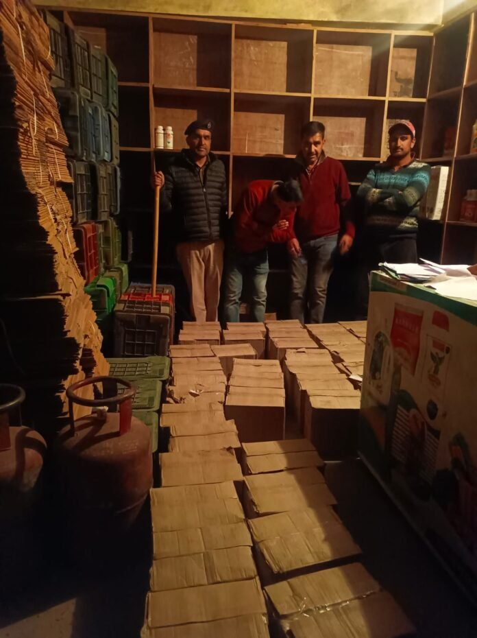 जिला शिमला के अंतर्गत आने वाले उपमंडल कोटखाई के टिककारी हिमरी में सड़क किनारे दुकान से पुलिस ने 68bपेटी अवैध शराब पकड़ी | जानकारी देते हुए डीएसपी ठियोग सिद्धार्थ शर्मा ने कहा कि उनके कर्मचारियों लगभग 12:15 बजे गश्त पर थे मुखबिर से सूचना मिली कि प्रताप ठाकुर पुत्र हेत राम निवासी ग्राम. टिककारी पीओ हिमरी त० कोटखाई जिला शिमला हिमाचल प्रदेश ने टिककारी में सड़क किनारे दुकान लगाई है। जिसमें वह भारी मात्रा में बाहरी राज्य की शराब का भंडारण करता है। इस सूचना पर एस.आई./एस.एच.ओ. ने उपरोक्त स्थान पर छापा मारा और 14 पेटी अंग्रेजी शराब मार्का रॉयल स्टैग बरामद किया, प्रत्येक बॉक्स में 12 बोतलें और प्रति बोतल 750 एमएल, बीयर मार्का टुबॉर्ग के 06 बॉक्स प्रत्येक बॉक्स में 12 बोतलें और प्रति बोतल 650 एमएल, बीयर के 07 बॉक्स थे। मार्का किंगफिशर के प्रत्येक बॉक्स में 12 बोतलें और प्रति बोतल 650 मिली, देशी शराब के 44 डिब्बे मार्का एम्पायर नंबर 1 मोटा संतरा चंडीगढ़ में बिक्री के लिए प्रत्येक बॉक्स में 12 बोतलें और प्रति बोतल 750 मिली और एक वाहन नंबर एचपी09सी-9914 दुकान के सामने खड़ा था वाहन की तलाशी लेने पर 7 पेटी देसी शराब मार्का एम्पायर नंबर 1 मोटा संतरा चंडीगढ़ में बिक्री के लिए रखी गई है, प्रत्येक पेटी में 12 बोतलें और एक बोतल में 750 एमएल बरामद किया गया है। इस छापेमारी में कुल 78 पेटी (936 बोतल) अंग्रेजी व देशी शराब व बीयर बरामद की गई है | इस पर थाना कोटखाई में उपरोक्त प्राथमिकी दर्ज की गयी है और आगे की कारवाही की जा रही है |