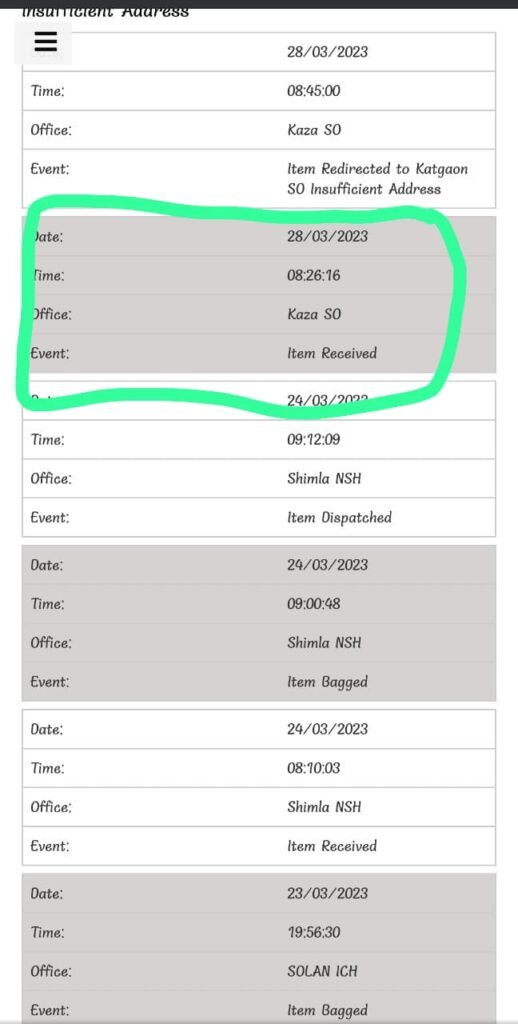 जहां एक ओर नीजि कंपनियां डाक सेवा को लेकर इंडिया पोस्ट को कड़ी टक्कर दे रहे हैं तो वहीं, कहीं का पार्सल कहीं और भेजे जाने पर कई प्रश्न खड़े कर रहा है। किन्नौर जिला के काफनू निवासी एडवोकेट अनिरुद्ध सिंह नेगी ने बताया कि उन्होंने सोलन से 23 मार्च को दवाई का पार्सल मंगवाया था। पार्सल उन्हें सही समय पर नहीं मिला। जिस कारण उन्होंने इंडिया पोस्ट की साईट पर जा कर ट्रेक किया और साईट पर पता चला कि उनका पार्सल तो काजा डाक खाने में पंहुच गया है।