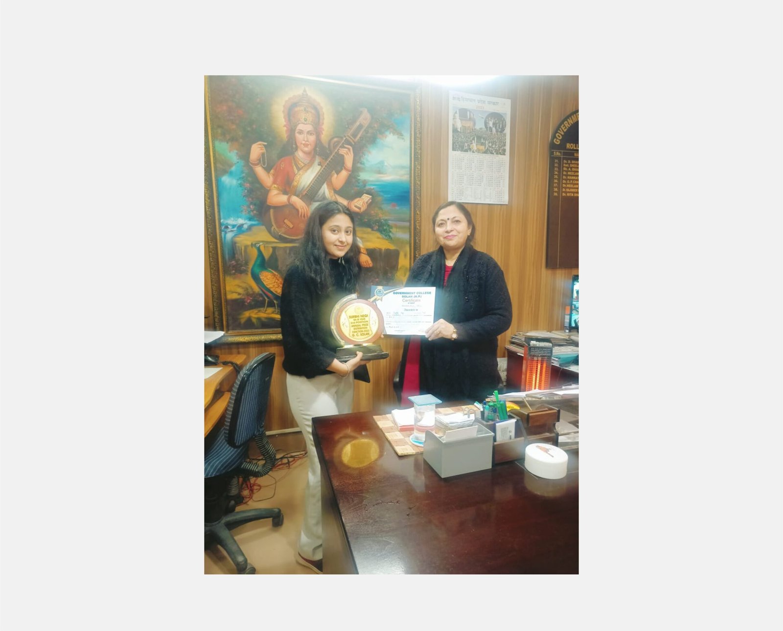 किन्नौर जिले के काफनू गांव की सुरभि नेगी को हिमाचल प्रदेश विश्वविद्यालय में आर्ट्स संकाय में तीसरा स्थान हासिल करने पर राजकीय महाविद्यालय सोलन की प्राचार्य ने स्मृति चिन्ह और प्रशस्ति पत्र देकर सम्मानित किया है। सुरभि नेगी की इस उपलब्धि पर उनके पिता पूर्व प्रधान दिग्विजय सिंह नेगी और माता बबिता नेगी ने खुशी जाहिर की है। गौरतलब है कि सुरभि नेगी की प्रारम्भिक शिक्षा सेंट लियूक्स स्कूल सोलन से हुई है। सुरभि नेगी ने इस मुकाम को कड़ी मेहनत और गुरु जनों सहित माता पिता के सही मार्ग दर्शन से हासिल किया।
