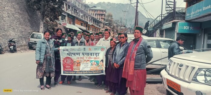 महिला एवं बाल विकास विभाग द्वारा 3 अप्रैल यानी आज तक बनाए जा रहे पोषण पखवाड़ा कार्यक्रम के तहत जिले के एक नालू आंगनबाड़ी केंद्र में आज कार्यक्रम का आयोजन किया गया जिसमें मोटे अनाजों के प्रति जागरूक किया गया। बता दें कि आंगनबाड़ी केंद्र एक नालू में मोटे अनाजों के साथ लोकल व्यंजनों की भी प्रदर्शनी लगाई गई। इसी कड़ी में जिला किन्नौर में पोषण पखवाड़ा के माध्यम से मोटे अनाज को खान-पान में शामिल कर स्वस्थ भोजन और पोषण बारे जागरूक किया गया। जिला किन्नौर में अंतर्राष्ट्रीय मोटा अनाज वर्ष के तहत 20 मार्च से 03 अप्रैल, 2023 तक पोषण पखवाड़ा आयोजत किया गया। जिला किन्नौर में पोषण पखवाड़ा के तहत मोटे अनाज जैसे ओगला, फाफड़ा, कोदा, रागी, कावनी इत्यादि को दिनचर्या के खान-पान में शामिल करने की आवश्यकता पर बल दिया गया। मोटे अनाज के उपयोग से विभिन्न बीमारियों जैसे शुगर, उच्च-रक्तचाप, हाइपर टैंशन इत्यादि से बचाव होता है। पोषण पखवाड़ा में लोगों को मोटे अनाज के इस्तेमाल के साथ-साथ घर में उगाई गई सब्जियों को भी दिनचर्या में शामिल करने की विशेषताएं व लाभ बारे जानकारी प्रदान की गई। इस दौरान जिला कार्यक्रम कार्यालय से प्रीति नेगी, पर्यवेक्षक सरिता नेगी व जिले के कल्पा खंड के सभी आंगनबाड़ी केंद्र के कार्यक्रताएं मौजूद रहे ।