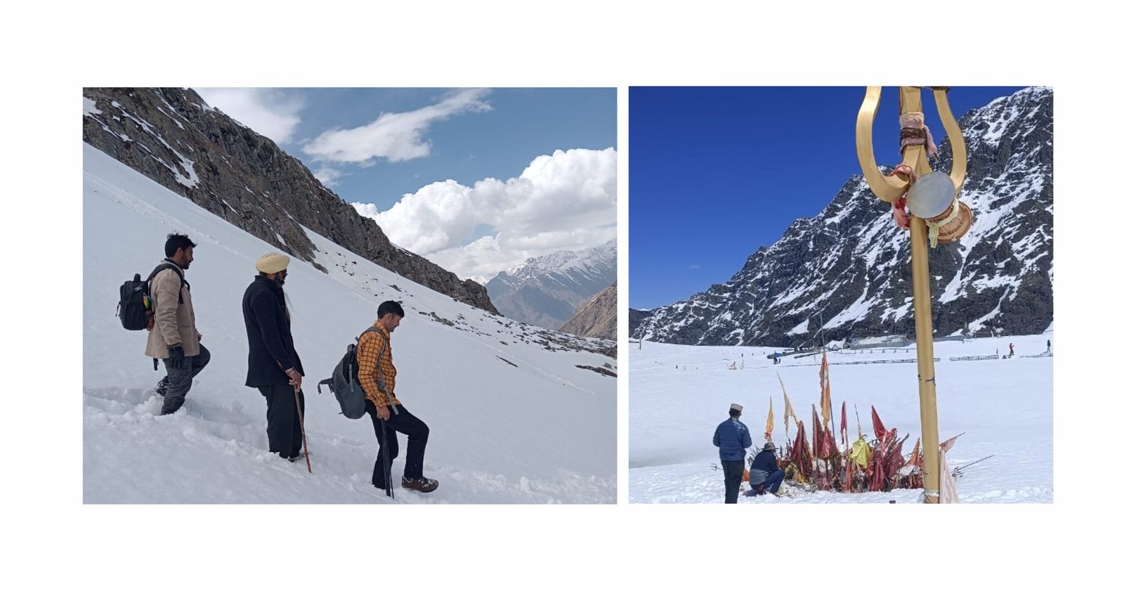 विश्व -विख्यात पवित्र मणिमहेश कैलाश धाम जहां पर पंहुचने का हर श्रद्धालुओं का दिल करता है लेकिन अप्रैल माह में भारी बर्फबारी में वहां पंहुचना काफी जोखिम भरा रहता है | गत वर्ष ही नुरपूर कांगडा के दो युवकों द्वारा फरवरी माह में ही मणिमहेश जाने के लिए कूच किया था लेकिन उन्हें बीच रास्ते से ही वापिस लौटना पड़ा, उसके बाद 11 अप्रैल को पंजाब के श्रद्धालुओं द्वारा भारी बर्फबारी में मणिमहेश पंहुचने में कामयाबी हासिल की व प्रथम दर्शन मणिमहेश मंदिर 2023 के दर्शन भी सर्वप्रथम उनके नाम रहे | भारी बर्फबारी में उनके द्वारा मणिमहेश मंदिर में फूलों की बरसात कर पूजा अर्चना की गई | सोशल मीडिया पर उनकी पोस्ट को सभी ने सराहा व उनकी शिव भक्ति की भी तारीफ की | शुक्रवार को दूसरा पंजाब का ग्रुप स्थानीय ट्रैकर पप्पू गाईड, विटु गाईड की अगुवाई में मणिमहेश झील के दर्शन कर शकुशल लौटा, जिसमें 25 लोग शामिल थे | यह जानकारी देते हुए हडसर गांव के निवासी व स्थानीय ट्रैकर गाईड पप्पू शर्मा ने बताया कि शुक्रवार को हमारा ग्रुप मणिमहेश झील के दर्शन कर शकुशल लौटा | उन्होंने बताया कि अभी भी मणिमहेश झील पर 8 फीट के करीब बर्फ है व रास्ते में भी ग्लेशियर है बिना गाईड व जानकारी के अभाव में वंहा पंहुचना असंभव ही नहीं बल्कि खतरों से भी खाली नहीं है | अभी धनछो तक ही रहने व खाने की सुविधा गाईड पप्पू द्वारा दी जा रही है उसके ऊपर का रास्ता भारी बर्फबारी से भरा है |