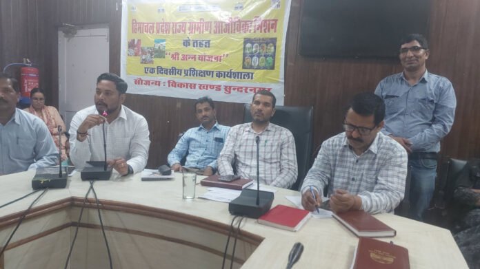 विकास खंड कार्यालय सुंदरनगर में खंड विकास अधिकारी विवेक चौहान की अध्यक्षता में अन्न योजना के अंतर्गत एक दिवसीय प्रशिक्षण शिविर का आयोजन किया गया। शिविर में विभिन्न स्वयं सहायता समूह की लगभग 400 महिलाओं ने भाग लिया। इस शिविर मे विभिन्न विभागों से आए हुए अधिकारियों ने अपने-अपने विभागों की योजनाओं के बारे में जानकारी दी और अन्न योजना के अंतर्गत मोटे अनाज की उपयोगिता और उसके उत्पादन का महत्व के बारे में महिलाओं को विस्तार पूर्वक बताया गया। जानकारी देते हुए विकास खंड अधिकारी विवेक चौहान ने बताया कि अन्न योजना के अंतर्गत एक दिवसीय प्रशिक्षण शिविर आयोजित किया गया जिसमें स्वयं सहायता समूह की लगभग 400 महिलाओं को मोटे अनाज को लेकर जानकारी दी गई। उन्होंने कहा कि मोटे अनाज का महत्त्व हमारी जिंदगी में जरूरी है। उन्होंने कहा की मोटे अनाज के माध्यम से ही इंसान स्वस्थ रह सकता है। इस अवसर पर कृषि प्रसार अधिकारी शमशेर सिंह और बागवानी विकास अधिकारी डॉ. राजेश शर्मा, डॉक्टर नवीन और आत्मा प्रोजेक्ट से शिवानी उपस्थित रही। इस शिविर का संचालन खंड समन्वयक किशोरी लाल व खंड विकास प्रबंधक अंजू ठाकुर ने किया।