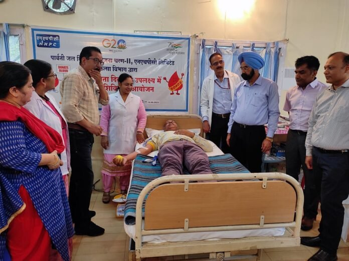 विश्व रक्तदाता दिवस के उपलक्ष्य में एनएचपीसी पार्बती जल विद्युत परियोजना चरण – II में क्षेत्रीय अस्पताल कुल्लू के सहयोग से एनएचपीसी चिकित्सालय, नगवाई कार्यालय परिसर में आज रक्तदान शिविर का आयोजन किया। परियोजना प्रमुख निर्मल सिंह ने शिविर का उद्घाटन करते हुए रक्तदान की आवश्यकता पर जोर देते हुए कहा कि रक्तदाता दूसरों की जान बचाने में अपना योगदान दे सकता है। इस अवसर पर डॉ. ज्योतिर्मय जैन मुख्य चिकित्सा अधिकारी ने प्रत्येक स्वस्थ्य व्यक्ति से रक्तदान करने का आग्रह किया। रक्तदान शिविर में पार्बती परियोजना व डुगर परियोजना के कार्मिको ने रक्तदान किया। इस रक्तदान में 35 यूनिट रक्त एकत्रित किया गया। अशोक कुमार शर्मा, महाप्रबंधक (वित्त), साजन मोइदीन, महाप्रबंधक (यांत्रिक), श्वेता ओझा, उप महाप्रबंधक (मानव संसाधन), डॉ. विशाल, क्षेत्रीय अस्पताल कुल्लू, अपनी टीम के साथ उपस्थित रहे।