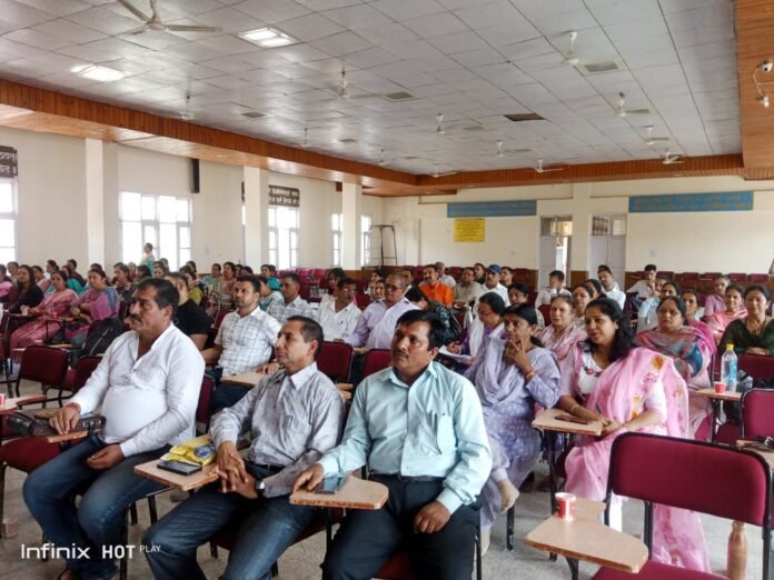 आज राष्ट्रीय शिक्षा नीति 2020 के तहत प्राथमिक शिक्षा खंड सोलन में प्राथमिक शिक्षकों को विशेष रूप से कक्षा प्रथम व कक्षा द्वितीय के विद्यार्थियों को अंग्रेजी माध्यम से पढ़ाने के लिए और कौशल क्षमता बढ़ाने हेतु दो दिवसीय अनिवार्य प्रशिक्षण कार्यक्रम के द्वितीय सत्र का शुभारम्भ आज किया गया | इस प्रशिक्षण कार्यशाला का मुख्य उद्देश्य प्राथमिक स्तर पर बच्चों को अंग्रेजी माध्यम से पढ़ाने के लिए अध्यापकों को विशेष तकनीकों को सिखाना है, ताकि सरकारी पाठशाला में पढ़ाई कर रहे छात्रों को निजी पाठशालाओं के तर्ज पर शिक्षा ग्रहण करने का शुभ अवसर प्राप्त हो सके | इस प्रशिक्षण कार्यक्रम का शुभारंभ उच्च शिक्षा उपनिदेशक सोलन डॉo जगदीश चंद्र नेगी द्वारा किया गया | इस विशेष अवसर पर जिला शिक्षा अधिकारी राज कुमार पराशर, मोहित व डाइट से प्रोग्राम कोऑर्डिनेटर नीलम परिहार पर्यवेक्षक व राजेश शर्मा खंड पर्यवेक्षक के रूप में उपस्थित रहे | खंड शिक्षा अधिकारी हरी राम चंदेल द्वारा बताया गया कि अंग्रेजी माध्यम को पाठशालाओं में लागू करने से सरकारी स्कूलों के नामांकन में भी वृद्धि होगी | इस कार्यक्रम को सुचारू रूप से चलाने के लिए राज्य की ओर से प्रशिक्षण प्राप्त कर चुके अंग्रेजी विषय के लिए दिलीप सिंह वर्मा प्रवक्ता अंग्रेजी, गणित के लिए प्रवक्ता अंजलि सूद व कनिष्ठ बुनियादी अध्यापक शशि पाल शर्मा ने सभी शिक्षकों को प्रशिक्षण दिया |इस सत्र से सभी पाठशालाओं में अंग्रेजी माध्यम के लागू होने से एकरूपता व समता का आएगी | सभी अध्यापकों द्वारा विभाग की ओर से इस विशेष शुरुआत का स्वागत किया और बताया कि इस ट्रेनिंग में हमने अनुभवात्मक गतिविधियों व खेल गतिविधियों के माध्यम से शिक्षण की बहुत सी नई गतिविधियों व नवाचारों को जाना, जिन्हे हम अपने स्कूलों में छात्रों के साथ प्रभावी तरीके से प्रयोग करेंगे |