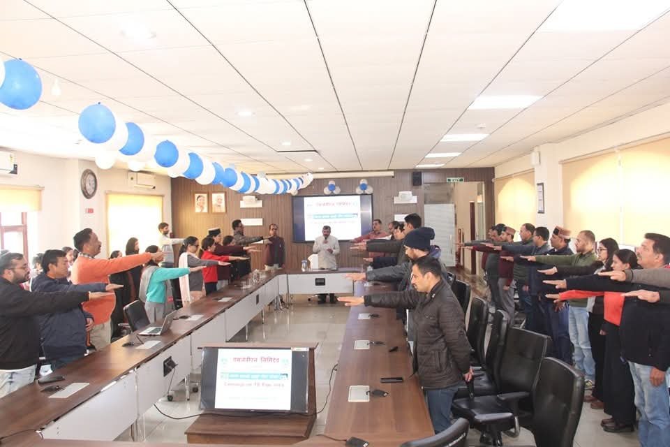 भारत सरकार के 2025 तक देश से क्षय रोग (टीबी) को समाप्त करने के लक्ष्य के तहत चलाए जा रहे 100 दिवसीय टीबी उन्मूलन अभियान के अंतर्गत आज नाथपा झाकड़ी हाइड्रो पावर स्टेशन में कार्यकारी निदेशक/परियोजना प्रमुख श्री मनोज कुमार के द्वारा अधिकारियों/कर्मचारियों को टीबी मुक्त भारत शपथ दिलवाई गई। इस शपथ के माध्यम से उन्होंने टीबी के प्रति जागरूकता बढ़ाने, रोग के लक्षणों की पहचान करने और प्रभावित व्यक्तियों को उपचार हेतु प्रोत्साहित करने का संकल्प लेने के लिए सभी को प्रेरित किया।