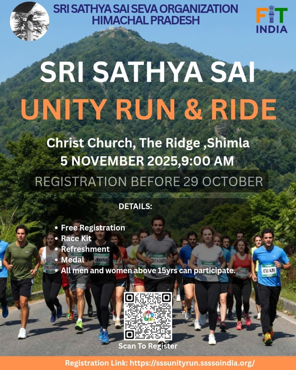 प्रेम,शांति और एकता का संदेश लेकर श्री सत्य साई यूनिटी रन का आयोजन 5 नवंबर को शिमला के ऐतिहासिक रिज मैदान में किया जाएगा। यह आयोजन श्री सत्य साई सेवा संगठन, हिमाचल प्रदेश द्वारा भगवान श्री सत्य साई बाबा के 100वें जन्म शताब्दी वर्ष के उपलक्ष्य में किया जा रहा है।प्रदेशाध्यक्ष प्रो. योगिंदर वर्मा ने बताया कि यह रन केवल फिटनेस इवेंट नहीं, बल्कि आत्मजागृति और समरसता का अभियान है, जो हर व्यक्ति के भीतर प्रेम और मानवता की ज्योति प्रज्वलित करेगा। उन्होंने युवाओं और नागरिकों से इस आयोजन में भाग लेने की अपील की।श्री सत्य साई बाबा की जन्मस्थली प्रशांति निलयम, पुट्टपर्ती (आंध्र प्रदेश) से 17 अगस्त को पाँच दिव्य मशालों के साथ यूनिटी रन की शुरुआत हुई थी। अब तक यह अभियान देश के 60 प्रमुख शहरों में पहुँच चुका है। हाल ही में पालमपुर में आयोजित रन में 897 प्रतिभागियों ने हिस्सा लिया।शिमला में यह आयोजन 5 नवंबर को प्रातः 9 बजे रिज मैदान से प्रारंभ होगा। प्रतिभागियों के लिए 3, 5 और 10 किलोमीटर की श्रेणियाँ निर्धारित की गई हैं। 15 वर्ष से अधिक आयु के पुरुष और महिलाएं 29 अक्तूबर तक ऑनलाइन लिंक https:sssunityrun.ssssoindia.org या QR कोड के माध्यम से निशुल्क पंजीकरण कर सकते हैं।सभी प्रतिभागियों को आकर्षक टी-शर्ट, बिब नंबर, पदक, ई-सर्टिफिकेट और रिफ्रेशमेंट प्रदान किए जाएंगे। यह आयोजन प्रेम, सेवा और एकता के माध्यम से स्वस्थ शरीर, शांत मन और सौहार्दपूर्ण समाज के निर्माण का संदेश देगा।