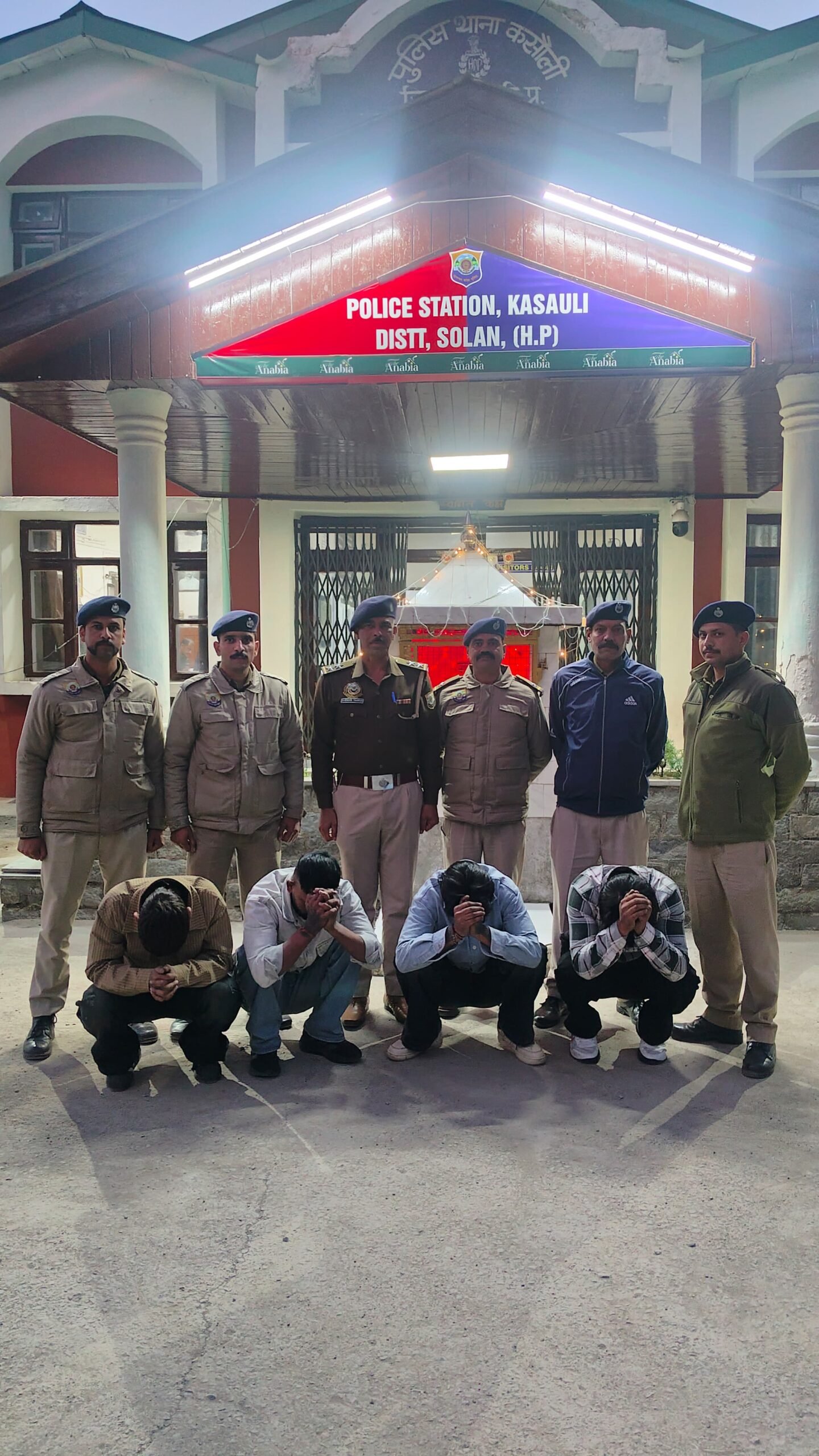 सोलन पुलिस ने जानकारी देते हुए मंगलवार दोपहर 1:00 बजे बताया कि सोलन पुलिस ने नशा तस्करों के खिलाफ अपनी शून्य सहनशीलता नीति को सख्ती से लागू करते हुए एक और बड़ी सफलता हासिल की है। एसआईयू सोलन की टीम ने सोमवार, 3 नवंबर को छतरी मोड़ कसौली के समीप एक स्विफ्ट कार में सवार चार युवकों को गिरफ्तार किया, जिनके पास से 62.13 ग्राम चिट्टा (हेरोइन) बरामद की गई।गिरफ्तार आरोपियों की पहचान विरेन्द्र सिंह, लखविन्द्र, कुनाल और किथू मट्टू, सभी निवासी लुधियाना, पंजाब के रूप में हुई है। जांच से पता चला है कि ये युवक कसौली, धर्मपुर और आसपास के क्षेत्रों में युवाओं तथा छात्रों को नशा सप्लाई करने की कोशिश में थे।फिलहाल चारों आरोपियों के खिलाफ पुलिस थाना कसौली में मामला दर्ज कर जांच जारी है। पुलिस ने बताया कि आरोपियों के पूर्व आपराधिक रिकार्ड की भी जांच की जा रही है, जिसमें तीन आरोपी लड़ाई-झगड़े के मामलों में पहले से संलिप्त पाए गए हैं। सोलन पुलिस ने कहा है कि नशा तस्करी के खिलाफ यह मुहिम समाज को नशामुक्त बनाने की दिशा में एक मजबूत कदम है।