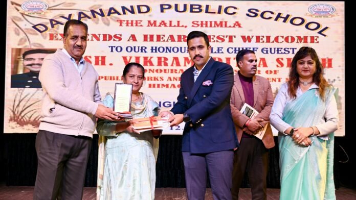 हिमाचल प्रदेश के लोक निर्माण एवं शहरी विकास मंत्री विक्रमादित्य सिंह ने कहा कि शिक्षा व्यक्तित्व विकास और समाज की बेहतरी के लिए आवश्यक है, जो ज्ञान, कौशल और मूल्यों को बढ़ावा देती है। वह आज गेयटी थियेटर शिमला में दयानंद पब्लिक पाठशाला द्वारा आयोजित वार्षिक पारितोषिक वितरण समारोह में मुख्य अतिथि के रूप में शामिल होने के उपरांत बच्चों एवं अभिभावकों को संबोधित कर रहे थे।उन्होंने सालभर विभिन्न गतिविधियों में अव्वल रहे मेधावी छात्र-छात्राओं को उज्जवल भविष्य के लिए बधाई एवं शुभकामनाएं देते हुए कहा कि शिक्षा आर्थिक और सामाजिक प्रगति का आधार है, जो बच्चों को नशे से दूर रखते हुए अपने भविष्य के लिए सही निर्णय लेने और चुनौतियों का सामना करने की क्षमता विकसित करती है। उन्होंने कहा कि प्रदेश सरकार शिक्षा में गुणवत्ता लाने के लिए नियमों में संशोधन करके सरकारी एवं निजी स्कूलों के अंतर को खत्म करने के लिए प्रयासरत है जिससे बच्चे अच्छी शिक्षा प्राप्त कर अपना भविष्य उज्ज्वल बना सके।कैबिनेट मंत्री ने कहा कि शिक्षा के क्षेत्र में दयानंद पब्लिक स्कूल शहर के अन्य स्कूलों के साथ अग्रणी स्कूलों में गिना जाता है। इसलिए इस प्रतिस्पर्धी युग में, जीवन में लक्ष्य प्राप्त करने के लिए हर बच्चे के पास अच्छी शिक्षा और ठोस ज्ञान हो, इस दिशा में दयानंद पब्लिक स्कूल सार्थक प्रयास कर रहा है जिसके लिए यह स्कूल बधाई का पात्र है। उन्होंने कहा कि हर बच्चे को स्कूल, कॉलेज व विश्वविद्यालय में बिताया हुआ समय सदा याद रहता है। उन्होंने बच्चों से आह्वान किया कि वह नशे से दूर रहकर एक सकारात्मक सोच के साथ आगे बढ़े और अपने जीवन के लक्ष्य को हासिल करें।उन्होंने कहा कि पूर्व मुख्यमंत्री स्वर्गीय राजा वीरभद्र सिंह पिछले समय में दयानंद पब्लिक स्कूल के कार्यक्रमों में शामिल होते थे और बच्चों को अपना आशीर्वाद देने के साथ-साथ स्कूल प्रबंधन की मांगो का निवारण करते थे। उन्होंने कहा कि स्कूल प्रबंधन के निमंत्रण पर उन्हें भी दयानंद पब्लिक स्कूल के कार्यक्रमों में आने के मौका मिला है। उन्होंने कहा कि वह दिल से स्कूल प्रबंधन के साथ खड़े हैं और प्रबंधन द्वारा रखी सभी मांगों को पूर्ण करने का प्रयास किया जायेगा।