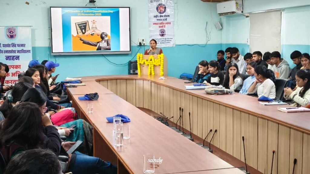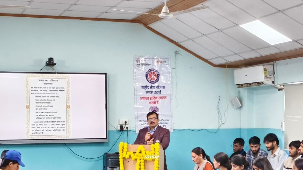 डॉ. वाई.एस. परमार राजकीय स्नातकोत्तर महाविद्यालय, नाहन में आज संविधान दिवस के उपलक्ष्य में एक भव्य एवं गरिमामय कार्यक्रम का आयोजन किया गया। यह कार्यक्रम महाविद्यालय की एनएसएस इकाई द्वारा राजनीतिक विज्ञान विभाग तथा लोक प्रशासन विभाग के संयुक्त सहयोग से आयोजित किया गया जिसमें लगभग 125 छात्र-छात्राओं ने उत्साहपूर्वक भाग लिया। जिला समन्वयक एनएसएस डॉ पंकज चांडक ने बताया कि