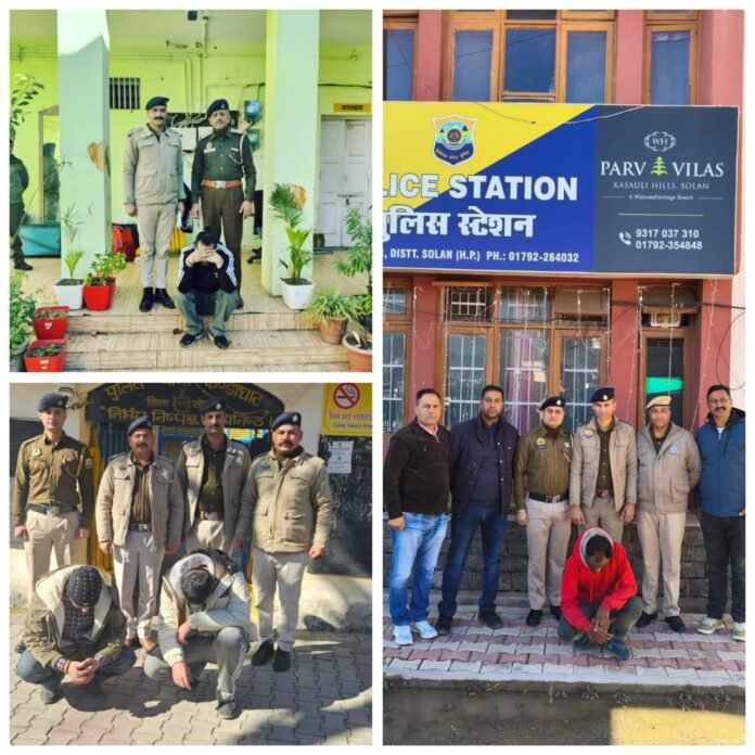 हिमाचल प्रदेश सरकार द्वारा चिट्टा तस्करों के विरुद्ध चलाये जा रहे प्रदेशव्यापी अभियान के अंतर्गत सोलन पुलिस द्वारा निरन्तर कार्यवाही की जा रही है I नशा तस्करी के कारोबार में संलिप्त आदतन अपराधियों पर लगातार कड़ी नजर राखी जा रही है जो इसी कड़ी में जिला पुलिस द्वारा चिट्टा तस्करी में संलिप्त रहे चार आदतन अपराधियों अंकुश ठाकुर पुत्र स्व० श्री शिव सिंह निवासी गाँव सिरीनगर, डाकखाना व तहसील कंडाघाट जिला सोलन हि०प्र० उम्र 36 वर्ष, नरेश कुमार उर्फ़ निशु पुत्र श्री राजेंदर ठाकुर निवासी गाँव सिरीनगर डाकखाना व तहसील कंडाघाट जिला सोलन हि०प्र० उम्र 37 वर्ष, दीपक कुमार उर्फ़ हनी पुत्र स्व० श्री हरबंस लाल निवासी गाँव धार के बेड समीप सनातन धर्म मंदिर धर्मपुर, डाकखाना धर्मपुर तहसील कसौली जिला सोलन हि०प्र० उम्र 40 वर्ष व विकास उर्फ़ खौला पुत्र पुत्र श्री शेर सिंह निवासी गाँव बेर गाँव डाकखाना चंबाघाट तहसील व जिला सोलन के सन्दर्भ में हिमाचल प्रदेश सरकार से PIT NDPS Act 1988 (Prevention of Illicit Traffic in Narcotic Drugs & Psychotropic Substances) के प्रावधानों के अनुसार निवारक हिरासत में रखने के आदेश पर इनको तीन तीन महीनो के लिए जिला कारागार में रखने के लिए जिला पुलिस टीमो द्वारा उक्त चारो आरोपियों को दिनाकं 07-12-2025 को हिरासत में लेकर जिला कारागार सोलन में आगामी 03 महीने के लिए भेजा गया I इन आदतन आरोपियों में 02 पुलिस थाना कंडाघाट,01 सदर सोलन व 01पुलिस थाना धर्मपुर के है I