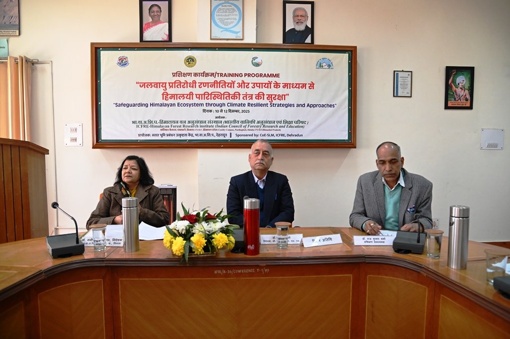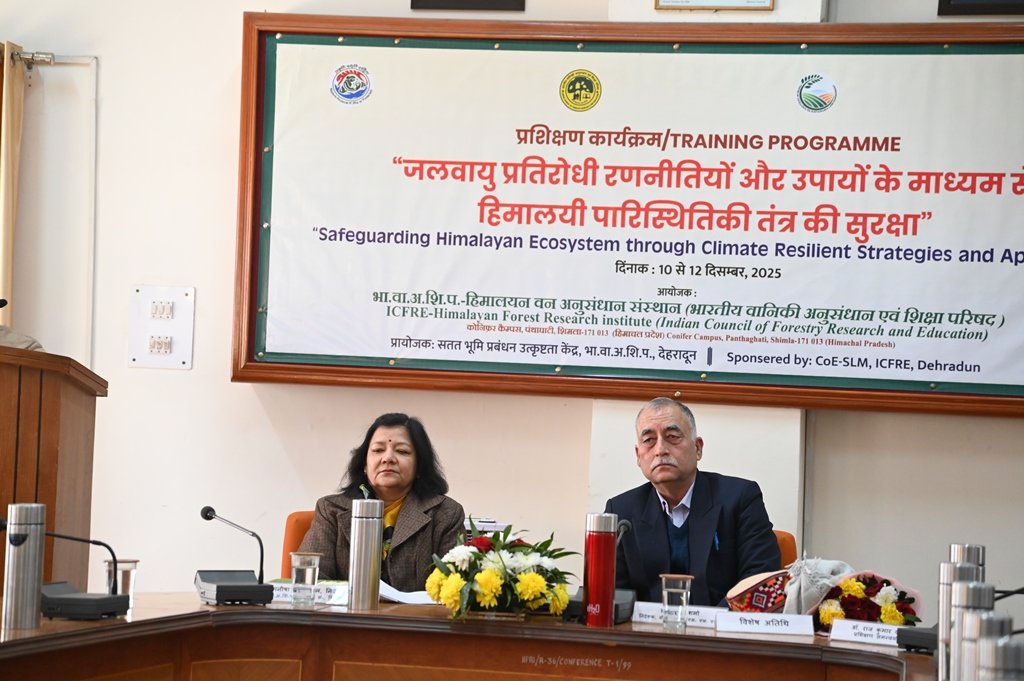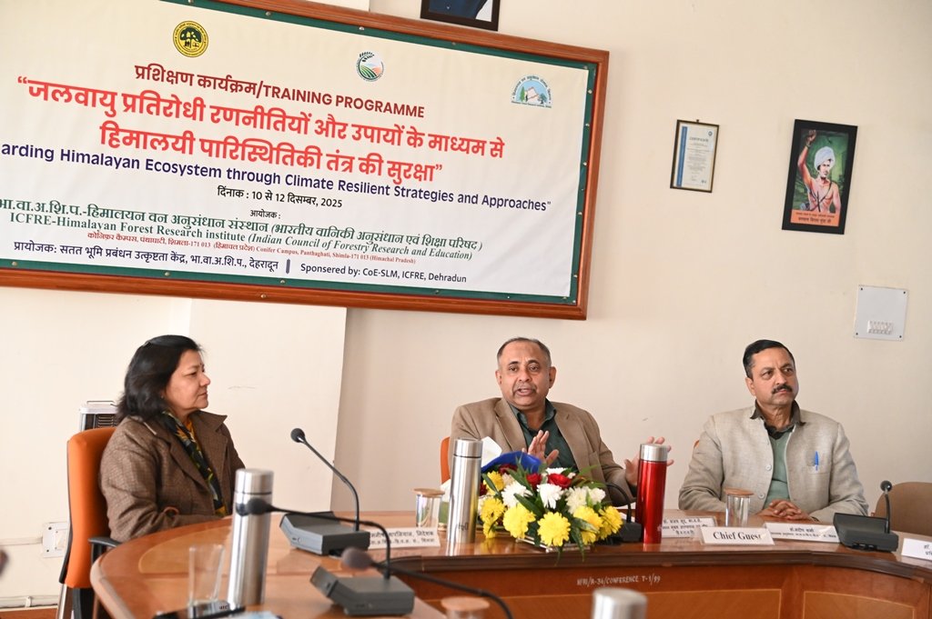 भा.वा.अ.शि.प.-हिमालयन वन अनुसंधान संस्थान, शिमला में “जलवायु प्रतिरोधी रणनीतियों और उपायों के माध्यम से हिमालयी पारिस्थितिकी तंत्र की सुरक्षा” विषय पर तीन दिवसीय प्रशिक्षण कार्यक्रम दिनांक 10.12.2025 से 12.12.2025 तक आयोजन किया जा रहा है । इस प्रशिक्षण कार्यक्रम में हिमाचल प्रदेश और जम्मू व कश्मीर केंद्र शासित प्रदेश के विभिन्न विभागो जैसे वन विभाग, पशु पालन विभाग, कृषि विभाग, उद्यान विभाग और अन्य विभागों से कुल 24 अधिकारियों (वन परिक्षत्र अधिकारी, कृषि विकास अधिकारी, बागबानी विकास अधिकारी, बागवानी विस्तार अधिकारी (एचईओ), एफईओ, पशु चिकित्सा अधिकारी, विषय वस्तु विशेषज्ञ (एसएमएस) व स्थानीय निकायों के प्रतिनिधि, ग्राम विकास समिति (वीडीसी) के सदस्य और गैर-सरकारी संगठन (एनजीओ) के सदस्यों ने भाग लिया। यह प्रशिक्षण कार्यक्रम भारतीय वानिकी अनुसंधान एवं शिक्षा परिषद, देहारादून में स्थापित सेंटर ऑफ एक्सलेन्स फॉर सस्टेनबल लैंड मैनेजमेंट, द्वारा प्रायोजित गया, जिसका मुख्य उद्देशय विभिन्न विभागो के अधिकारियों को एक मंच पर इकट्ठा कर जलवायु प्रतिरोधी रणनीतियों और उपायों के माध्यम से हिमालयी पारिस्थितिकी तंत्र की सुरक्षा की कारगर रणनीतियों और वैज्ञानिक विधियों के बारे में जानकारी प्रदान करना है । हिमाचल प्रदेश वन विभाग के प्रधान मुख्य अरणयपाल डॉ. संजय सूद, भा॰व॰से॰ ने प्रशिक्षण कार्यक्रम में बतौर मुख्य अतिथि शामिल हुए। सेंटर ऑफ एक्सीलेंस फॉर सस्टेनेबल लैंड डेवलपमेंट (CoE-SLM), देहरादून के निदेशक डॉ. राजेश शर्मा भी स्पेशल गेस्ट के तौर पर उपस्थित रहे ।