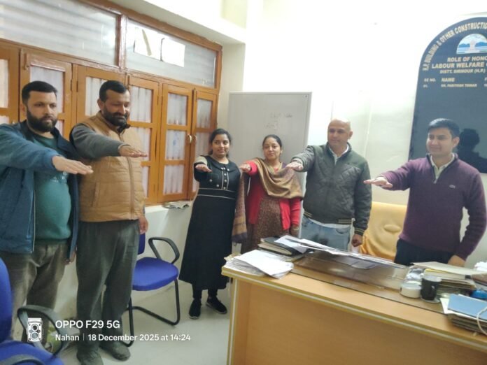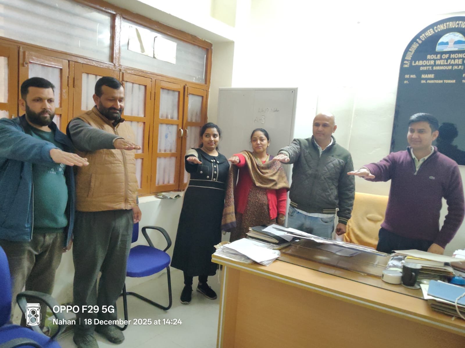 हिमाचल प्रदेश के मुख्यमंत्री सुखविन्द्र सिंह सुक्खू द्वारा शुरू किए गए ‘एंटी-चिट्टा अभियान’ के तहत आज नाहन स्थित कार्यालय श्रम कल्याण अधिकारी (HPBOCW) में एक विशेष जागरूकता कार्यक्रम का आयोजन किया गया। कार्यक्रम के दौरान कार्यालय के सभी अधिकारियों व कर्मचारियों ने नशे के खिलाफ एकजुट होकर नशा मुक्ति की शपथ ली।