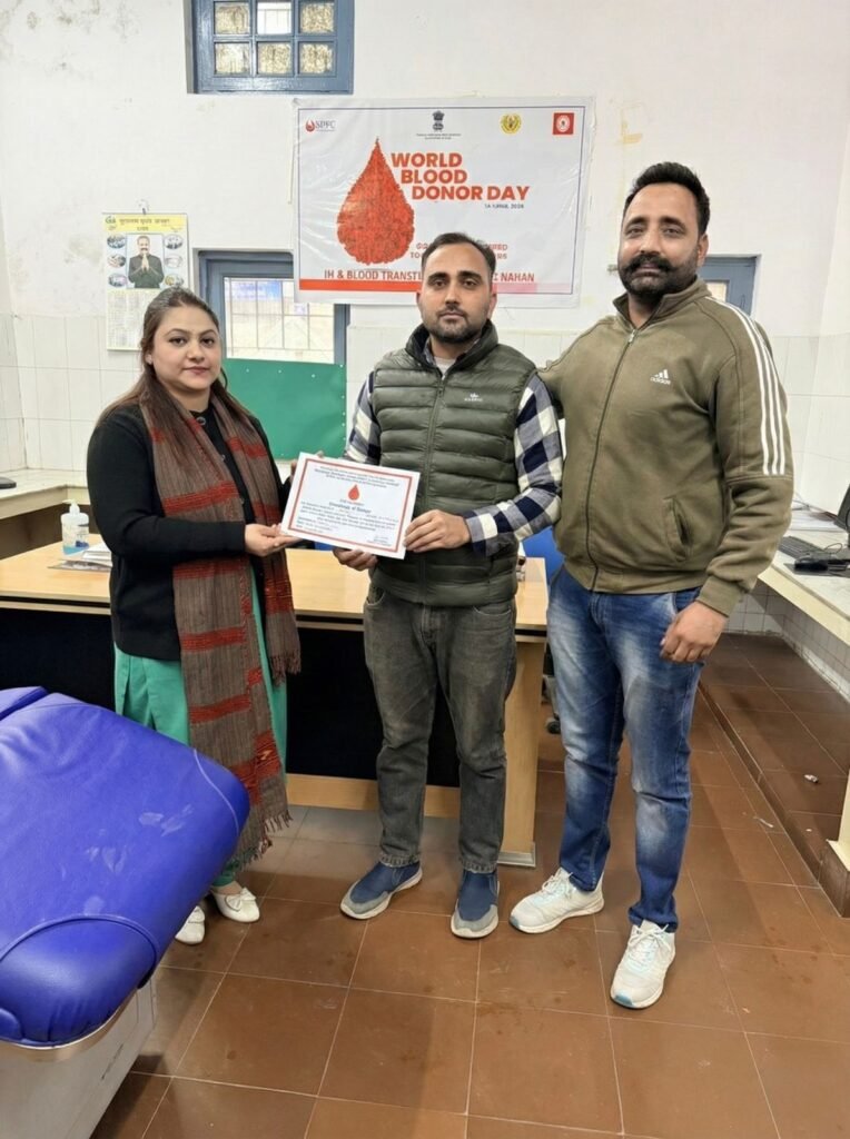 सोसायटी की ओर से मेडिकल कॉलेज नाहन में A- की 3, O+ की 5, AB+ की 9, B+ की 3, AB- की 1 और O- की 3 यूनिट रक्त उपलब्ध करवाकर अनमोल जिंदगी को बचाने में अपने सहयोग दिया। इसके अलावा विभिन्न ग्रुपों का 20 यूनिट रक्त पंचकुला, पीजीआई चंडीगढ़, मोहाली, देहरादून, और आईजीएमसी शिमला में दिया गया।