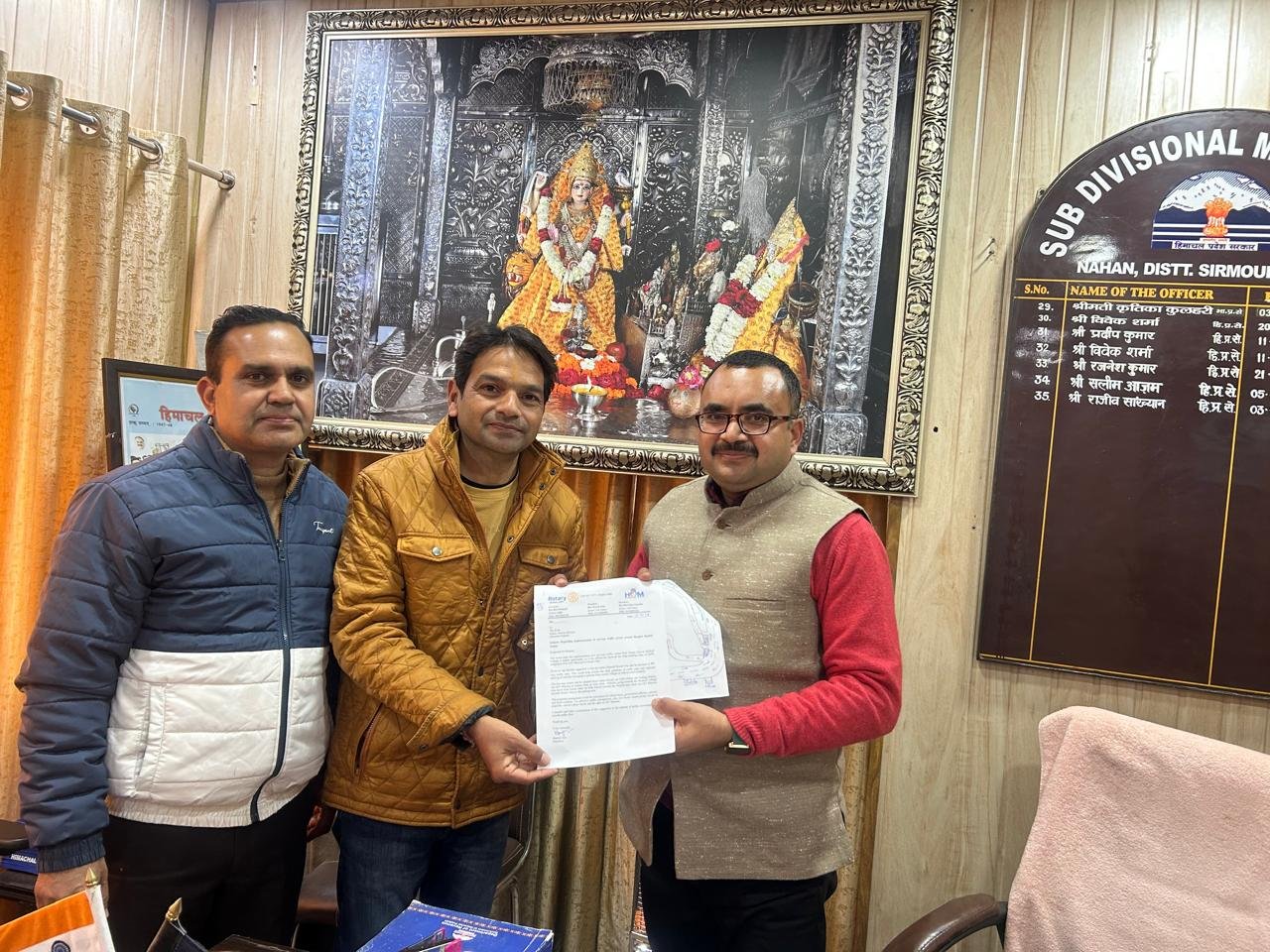 आज रोटरी क्लब नाहन के सदस्यों के एक प्रतिनिधिमंडल ने नाहन शहर की स्वच्छता एवं यातायात व्यवस्था से संबंधित सुझावों को लेकर एसडीएम नाहन राजीव संख्यान से भेंट की। इस अवसर पर रोटरी क्लब नाहन के अध्यक्ष मनीष जैन ने शहर में व्याप्त समस्याओं की ओर प्रशासन का ध्यान आकर्षित किया।