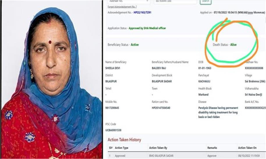 हिमाचल प्रदेश के बिलासपुर जिले की कचौली पंचायत के गांव साई ब्राह्मणा की रहने वाली शीला देवी को मुख्यमंत्री सहारा योजना में गलती से मृत दिखाने का मामला अब ठीक कर दिया गया है। मीडिया में मामला सामने आने के बाद स्वास्थ्य विभाग ने पोर्टल में सुधार करते हुए महिला की स्थिति ‘अलाइव’ कर दी है। इससे परिवार ने राहत की सांस ली है।